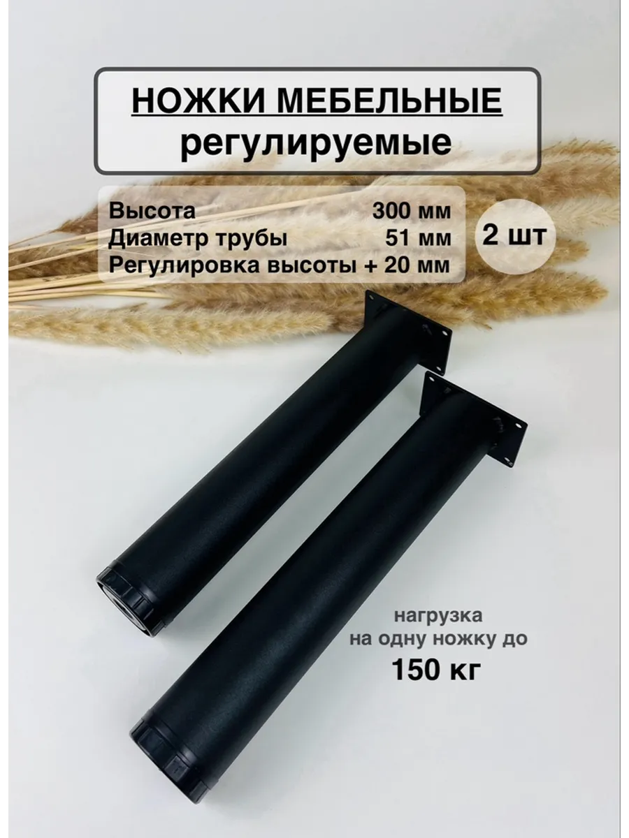Регулируемая высота до + 15 мм, позволяет идеально подогнать мебель под любой интерьер. В комплекте вы найдете 2 цельносварные опоры для мебели длиной 300 мм с диаметром трубы 51 мм и пластиной 50 мм х 80 мм, толщиной 2 мм.