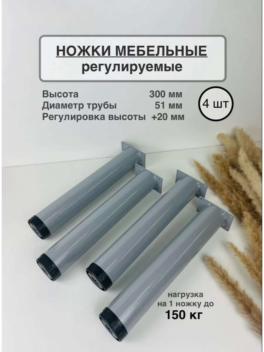 Регулируемая высота до + 15 мм, позволяет идеально подогнать мебель под любой интерьер. В комплекте вы найдете 4 цельносварные опоры для мебели длиной 300 мм с диаметром трубы 51 мм и пластиной 50 мм х 80 мм, толщиной 2 мм.