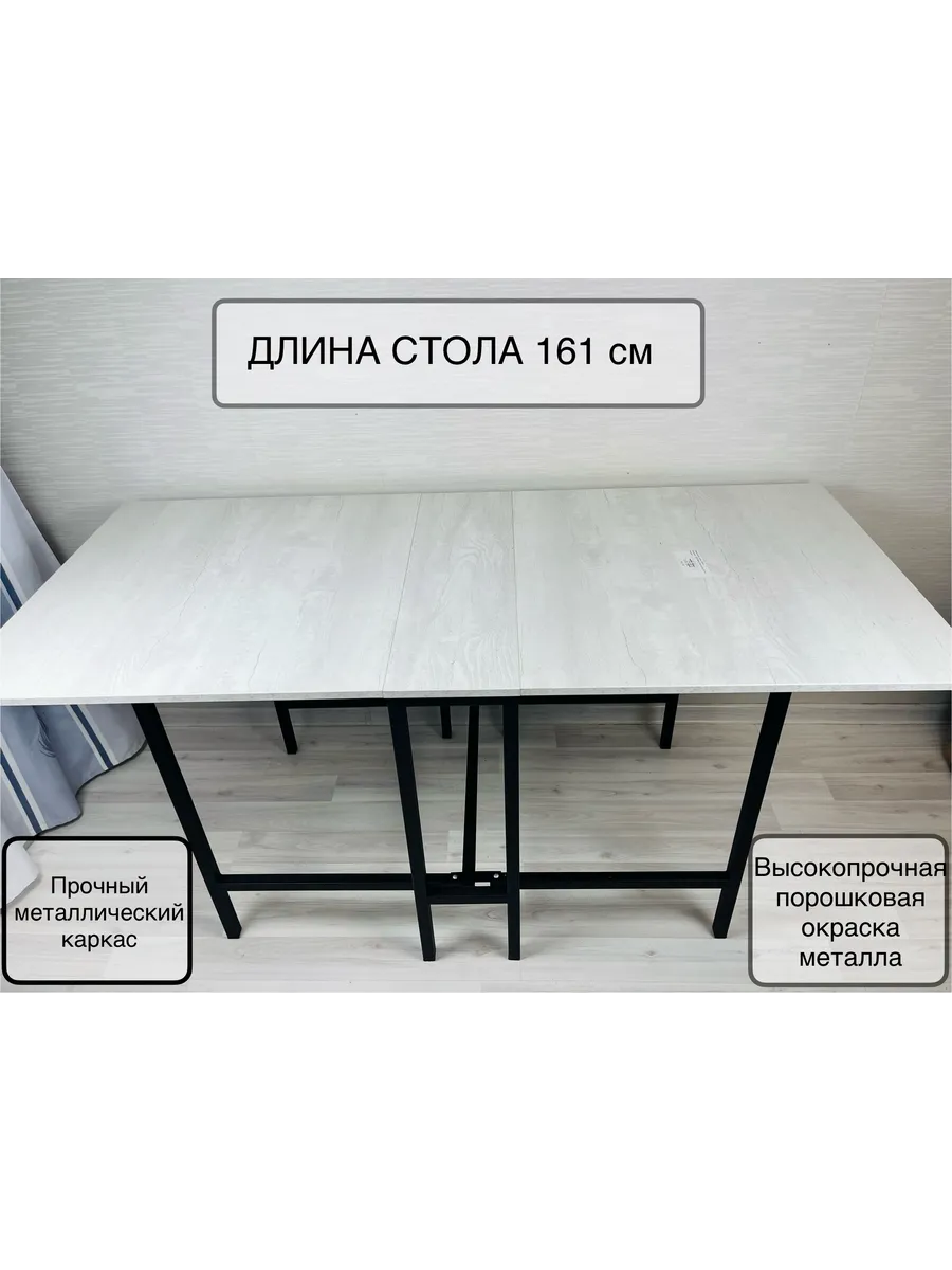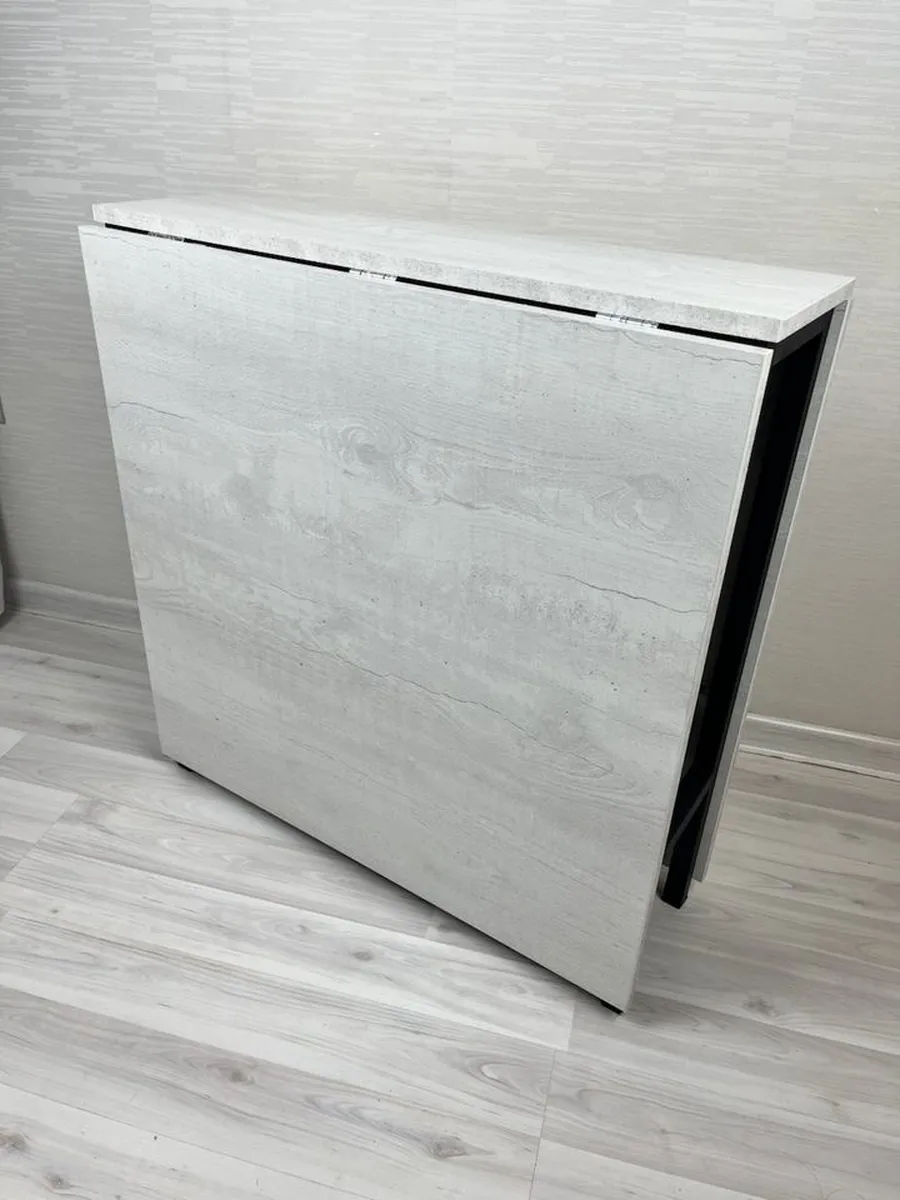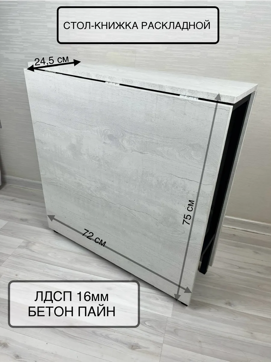 Стол-книжка раскладной, столешница ЛДСП 16 мм, высокое качество, цвет столешницы Белый Бетон Пайн, богатая текстура дерева, каждый рисунок уникальный, прочный, надёжный и устойчивый металлический каркас, цвет каркаса чёрный, высокопрочная порошковая окраска металла.