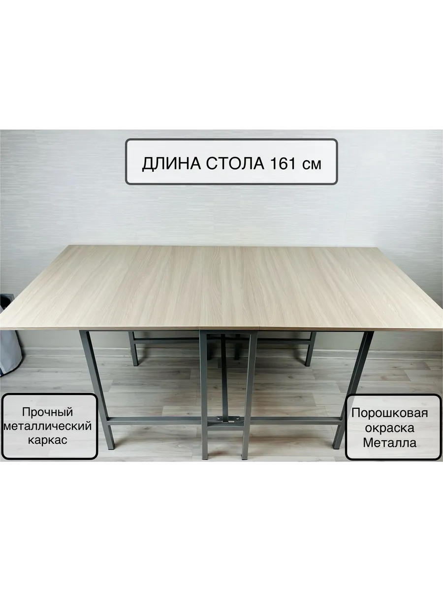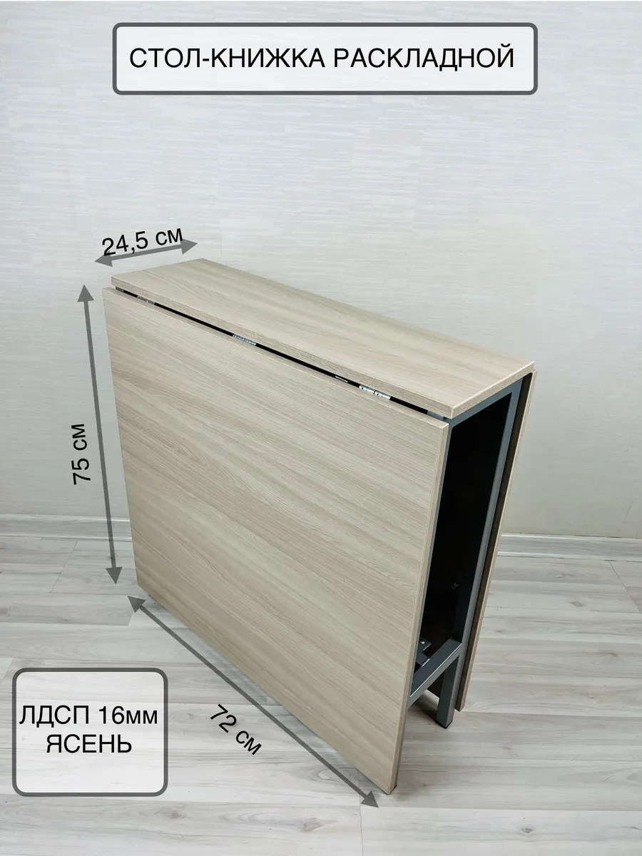 Стол-книжка раскладной, столешница ЛДСП 16 мм, высокое качество, цвет столешницы Ясень Светлый, богатая текстура, каждый рисунок уникальный, прочный, надёжный и устойчивый металлический каркас, цвет каркаса серый, высокопрочная порошковая окраска металла.