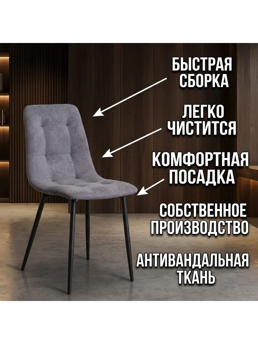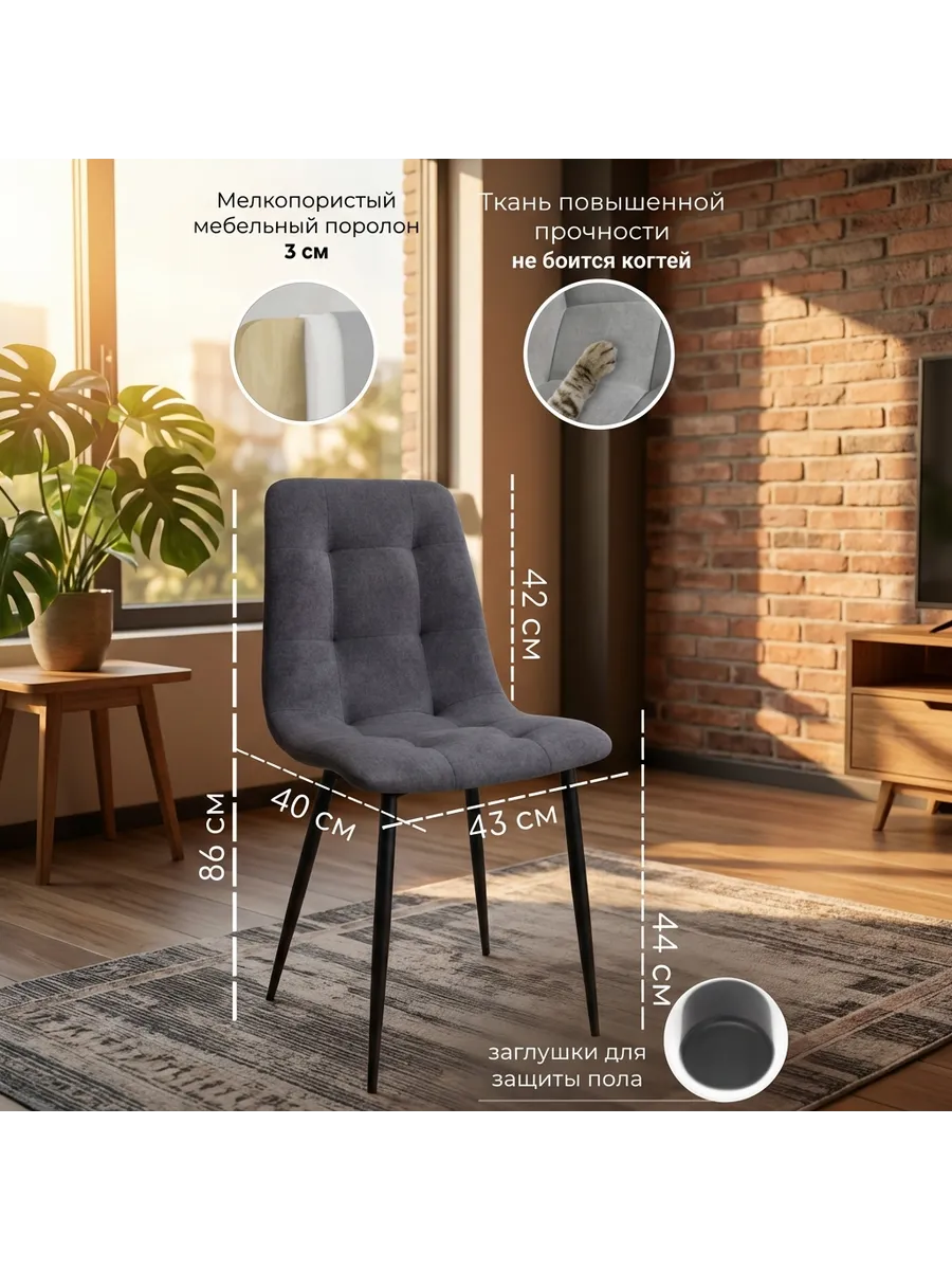 Высокое качество: Прочный каркас и износостойкая обивка, цвет графит, опоры черные, металлические.